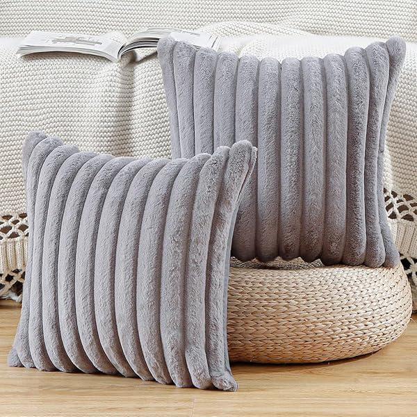 2枚セット フェイクファー プラッシュ スローピローカバー ふわふわストライプ ソフト装飾クッションカバー ソファ ベッドルーム ピローシェル用 40 x 40 cm グレー