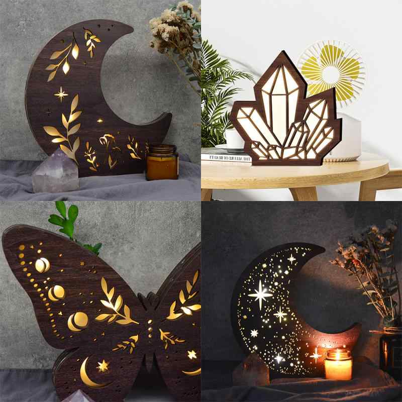ナイトライト LED発光 木製 ボヘミアン風 立体 星空 三日月 蝶 蓮の花 モチーフ 卓上 間接照明 おしゃれ かわいい インテリア 寝室 リビング 癒し 雰囲気作り ギフト
