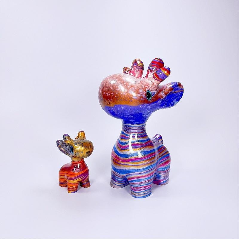 工芸品 置物 ハンドメイド 手描き彩色 漆塗り 楠木製 子鹿 オブジェ インテリア おしゃれ 幸運 開運 縁起物 見守り モチーフ モダンデザイン リビング 玄関飾り ギフト プレゼント