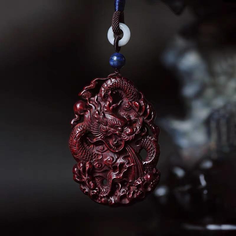 ネックレス 紫檀 木製 両面 透かし彫り 龍 彫刻 プレート ペンダント 無事牌 お守り 開運 幸運 厄除け ユニセックス アジアンテイスト 高級感 アクセサリー 普段使い