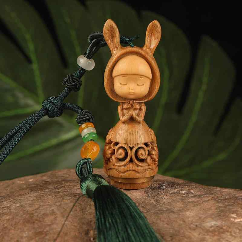 車用アクセサリー 女の子 緑檀 願いうさぎ 精密木彫り ウッドカービング DIY手編み マクラメ 車用飾り カーチャーム 車内装飾 開運 幸運 ラッキーアイテム おしゃれ かわいい 天然木