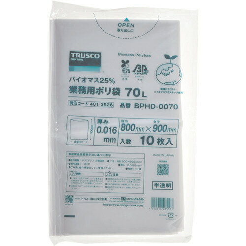 TRUSCO トラスコ中山 バイオマス25%ポリ袋0.016x800x900mm 10枚入(70L用・透明) [BPHD-0070] BPHD0070 販売単位:1