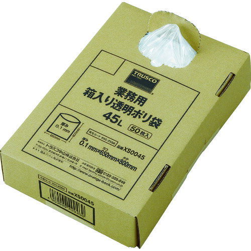 納期について:取寄品3〜5営業日目発送予定★欠品時除く【DIY 工具 ツール トラスコ中山 オレンジブック TRUSCO 工事book トラスコ 業務用 ポリ袋 大型 収納 ゴミ袋 45リットル ビニール袋 45l 透明】メーカー名:トラスコ中山(株)【 特長 】・厚さ0.05mmタイプです。・中身がよく見える透明タイプです。・非塩ビ素材を使用し、焼却時ダイオキシン、塩素ガスが発生しません。・1枚ずつ取り出しやすいパッケージです。(A-0020〜A-0120)・幅広い用途に使用できます。【 用途 】・ゴミ袋として。・部品などの保管、管理。・商品のカバーなどに。 仕様品名 TRUSCO 業務用ポリ袋 厚み0.05X45L 10枚入品番 A-0045色 透明縦(mm) 800横(mm) 650厚さ(mm) 0.05容量(L) 45【 材質/仕上 】再生ポリエチレン(PE)質量 480gJANコード 4989999361544【 注意 】●稀に黒点化した物が混ざりますが原料が酸化した物ですので使用上問題ありません。●A0045〜A0120は再生ポリエチレン使用のため透明度が若干劣ります。また、直接食品を入れないでください。