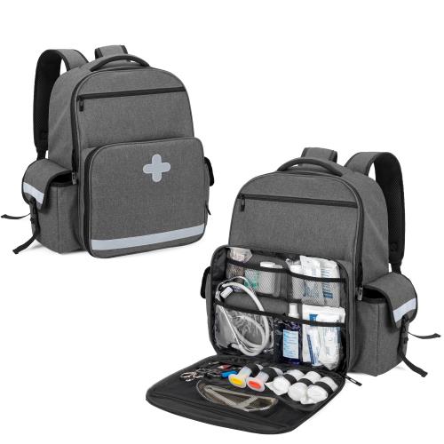 メインコンパートメントは大きくて、鋭利物処分容器、血圧計カフ、聴診器、ガーゼなどの医療用品を保管することができます。内部のマルチポケット設計は応急処置用品の整理に便利です。(バッグのみの販売ですので、アクセサリーが含まれておりません) フロントコンパートメントには4つオーポンポケット、1つのジッパーポケット、下部スロットを備えた複数の弾性ループがあります。弾性ループにはピンセット、はさみ、ペンライト、温度計などの小さな介護用品を収納することができます。 機能性:暗い夜でも簡単に認識できる反射ストリップが付いています。背面には識別しやすい緊急情報ウィンドウが付いています。2つのサイドポケットと小さな前ポケットもあります。 耐水性ポリエステル素材で作られています。ショルダーストラップとウェスト部に通気性のよいメッシュパッドを採用して、背負うのに快適です。フォームパッド入りのトップハンドルも付いています。 寸法:33.5cm x 22cm x 45.5cm。このバックパックは医療用品または防災グッズを1か所に保管するのに役立ちます。医学生、訪問看護師、医師、救急医療技術者へのプレゼントにもおすすめます。