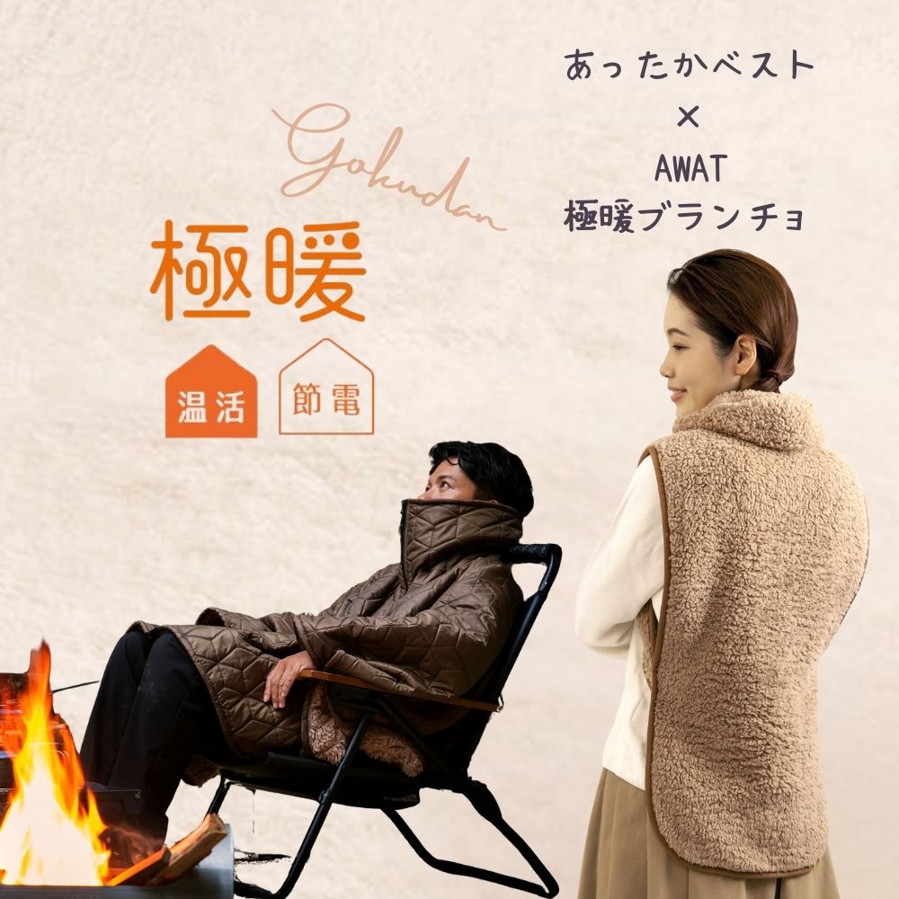 AWAT 極暖 ブランチョ・あったかベスト セット あったか ベスト グッズ あったかグッズ 背中 首 腰 羽織りもの 顔 周り あたため 防寒 冷え性 ねこベスト 家事 育児 暖かい 対策 肩 冷え 寒い アウトドア キャンプ 撥水 難燃 防災 家 自宅 ブランケット ポンチョ