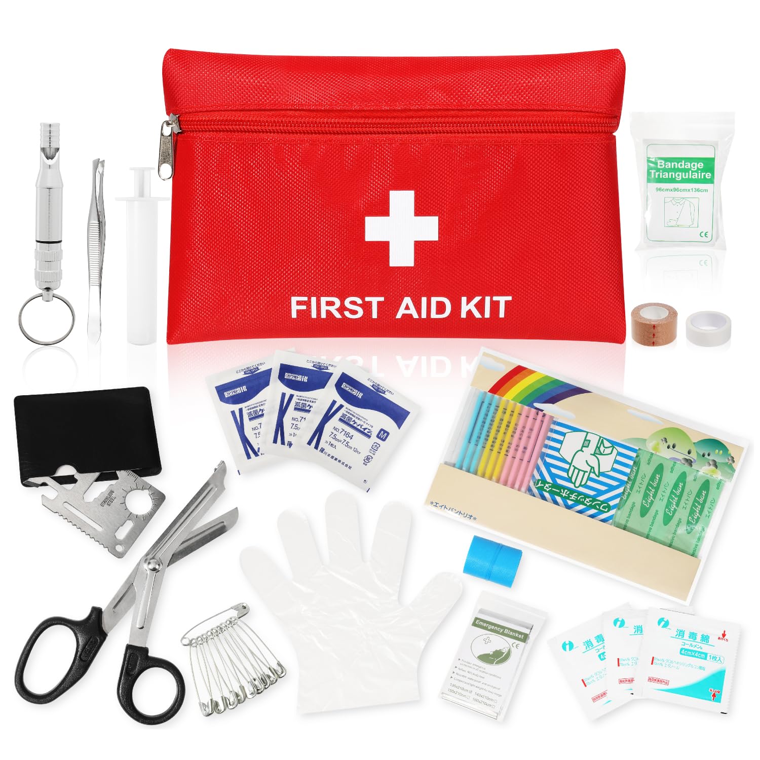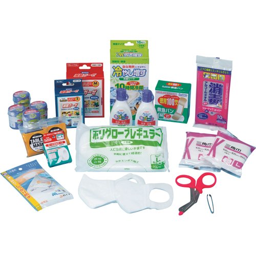 • ケース:アルミ • 三角巾×2枚 • 伸縮包帯(M×3個、L×1個)×2 • 滅菌ガーゼ(S:12枚入、M:10枚入)×1箱 • サージカルテープ×1個 • 消毒液×2本 • 消毒ウエットティッシュ(10枚入)×1袋 • 救急絆創膏(M:100枚)×1箱 • 防水パッド(M:5枚)×1袋、ポリグローブ(L:100枚)×1袋、3Dマスク(ふつう:6枚、こども用:4枚)×2、毛抜き×1個、万能はさみ×1個、一方弁マスク×2個、アルミケース×1個