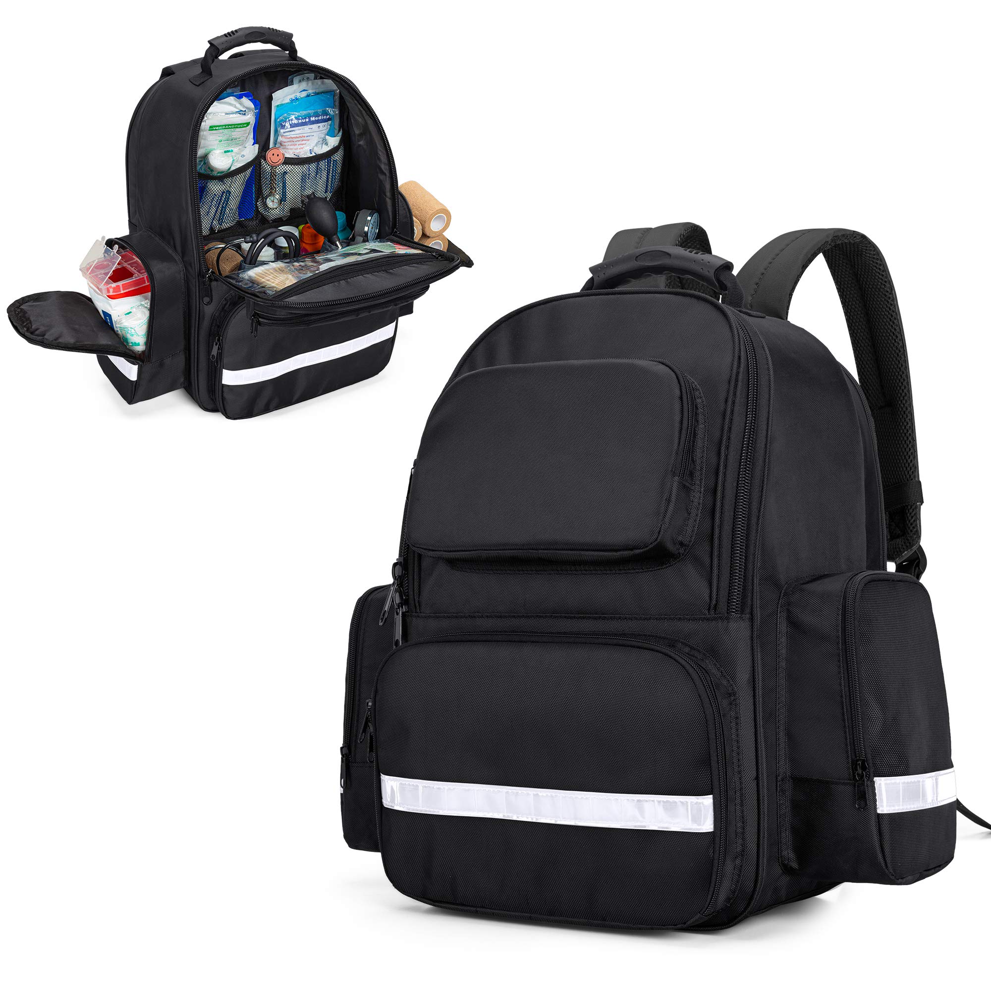 メインコンパートメントは大きくて、鋭利物処分容器、血圧計カフ、聴診器、ガーゼなどの医療用品を保管することができます。内部のマルチポケット設計は応急処置用品の整理に便利です。(バッグのみの販売ですので、アクセサリーが含まれておりません) フロントコンパートメントには4つオーポンポケット、1つのジッパーポケット、下部スロットを備えた複数の弾性ループがあります。弾性ループにはピンセット、はさみ、ペンライト、温度計などの小さな介護用品を収納することができます。 機能性:暗い夜でも簡単に認識できる反射ストリップが付いています。背面には識別しやすい緊急情報ウィンドウが付いています。2つのサイドポケットと小さな前ポケットもあります。 耐水性ポリエステル素材で作られています。ショルダーストラップとウェスト部に通気性のよいメッシュパッドを採用して、背負うのに快適です。フォームパッド入りのトップハンドルも付いています。 寸法:33.5cm x 22cm x 45.5cm。このバックパックは医療用品または防災グッズを1か所に保管するのに役立ちます。医学生、訪問看護師、医師、救急医療技術者へのプレゼントにもおすすめます。
