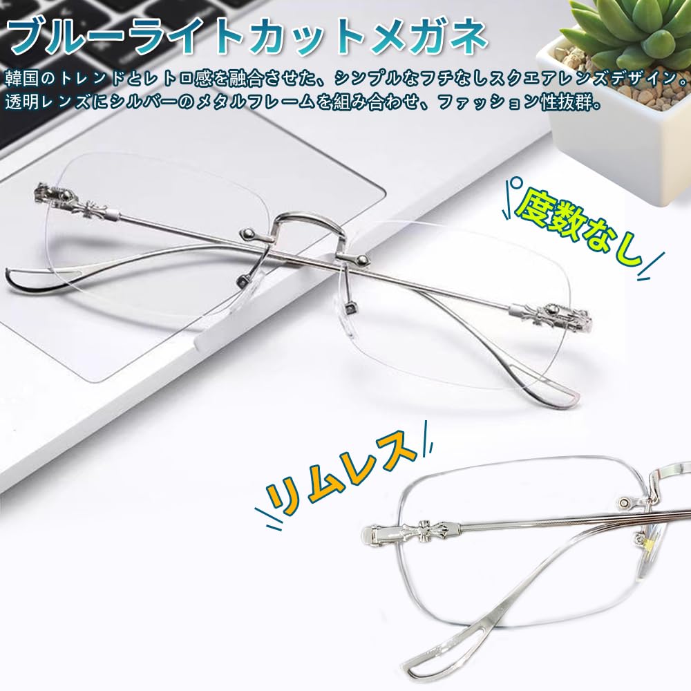 【トレンド感あふれる韓国風スタイル】韓国のトレンドとレトロ感を融合させた、シンプルなフチなしスクエアレンズデザイン。透明レンズにシルバーのメタルフ レームを組み合わせ、ファッション性抜群。普段のコーディネートにも簡単に取り入れられ、スタイリングのアクセントとして活躍します。【ブルーライトカットレンズで目をしっかり保護】有害なブルーライトを効果的にカットし、スマホ・パソコン・タブレットの長時間使用による目の疲れを軽減。仕事・勉強・娯楽など、様々なシーンで快適な視界と目の健康をサポ ートします。【軽量設計で快適な着け心地】軽量素材を採用しており、長時間の着用でも鼻や耳への負担を軽減。フレームレスデザインで顔の輪郭に自然にフィットし、眼鏡初心者や装着感に敏感な方にもおすすめです。【男女兼用 × 多用途対応】シンプルで汎用性の高いデザインは、通勤・通学・オフィスなど様々なシーンに適応。機能性だけでなくファッションアイテムとしても優秀で、自分用はもちろんプレゼントにも最適です。【商品情報】カラー:シルバー サイズ:全長146mm、フレーム幅56mm、フレーム高さ37mm、ブリッジ幅20mm、テンプル長さ145mm(※表記:1.460.560.37CM) 対応フェイス形状:ハート型・丸顔・四角顔・面長・楕円形顔など、幅広い顔型に対応。ほとんどの方にフィットするデザインです。説明 カラー:シルバー サイズ:全長146mm、フレーム幅56mm、フレーム高さ37mm、ブリッジ幅20mm、テンプル長さ145mm(※表記:1.460.560.37CM) 対応フェイス形状:ハート型・丸顔・四角顔・面長・楕円形顔など、幅広い顔型に対応。ほとんどの方にフィットするデザインです。