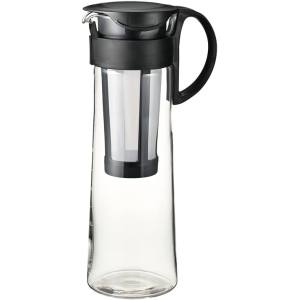 水出し コーヒー ストレーナーつき 耐熱 ガラス ピッチャー熱湯もOK、ストレーナー(濾し器)付きの、水出しコーヒーポット。水出しだから、熱による酸化を防ぎ、コーヒー豆本来の味を引き出すことができます。低温で抽出した水出しコーヒーは渋みが少なくまろやかな味わいです。スリムタイプだから、冷蔵庫の扉ポケットにも収まります。【コーヒー粉と水だけでアイスコーヒーが作れる!】(1)ストレーナーにコーヒー粉を入れ、ポットにセットする。 (2)コーヒー粉全体が湿るように少量ずつ水(軟水がおススメ)を注ぎ、「の」の字を描くようにドリップ。※お湯ではなく水で抽出してください。 (3)ポットにフタをして冷蔵庫で8時間程抽出。 (4)ポットを冷蔵庫から出し、ストレーナーを外したらできあがり。熱湯を注いでも割れない丈夫な耐熱ガラスを使用しているので、ストレーナーを外せば、他の飲み物を入れても使えます。 食器洗い乾燥機の使用ができるから、お手入れもラク。 ストレーナーの底が外れて洗いやすい仕様。サイズ(約)幅13.8×奥行9.4×高さ29.4cm口径(約)8.8cm材質:ガラスボール/耐熱ガラス「HARIO Glass」 フタ・ハンドルバンド・ストレーナーフレーム/ポリプロピレン メッシュ/ポリエステル重量(約)600g出来上がり容量(約)1L耐熱温度:ブッシング(シリコーンゴム)/180度 フタ・ハンドルバンド/110度耐熱温度差:本体/120度(耐熱温度差120度とは、急熱急冷したときの温度差が120度以内であれば割れないということで、耐熱性があるということです。)直火にかける、電子レンジ・オーブンでのご使用はおやめください。お作りになった水出しコーヒーは必ず冷蔵庫で保存し、2〜3日以内にお召し上がりください。日がたつと酸化が進みます。