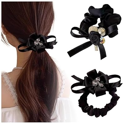ヘアゴム 髪ゴム シュシュ 細め パール付き 華やか キラキラ ヘアアクセサリー シンプル サテン 森ガール エレガント 上品さ 髪飾り 女性 高弾性 おしゃれ 日常 通勤 プレゼント 贈り物 (3点セット)