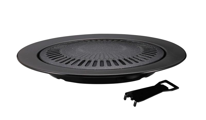 製品サイズ:(約)外径335×高さ40mm 製品重量:(約)700g 材質:本体/鉄(表面加工=ほうろう)、プレート/アルミニウム合金(ふっ素樹脂塗膜加工)、フックハンドル/鉄(焼付け塗装) 原産国:韓国