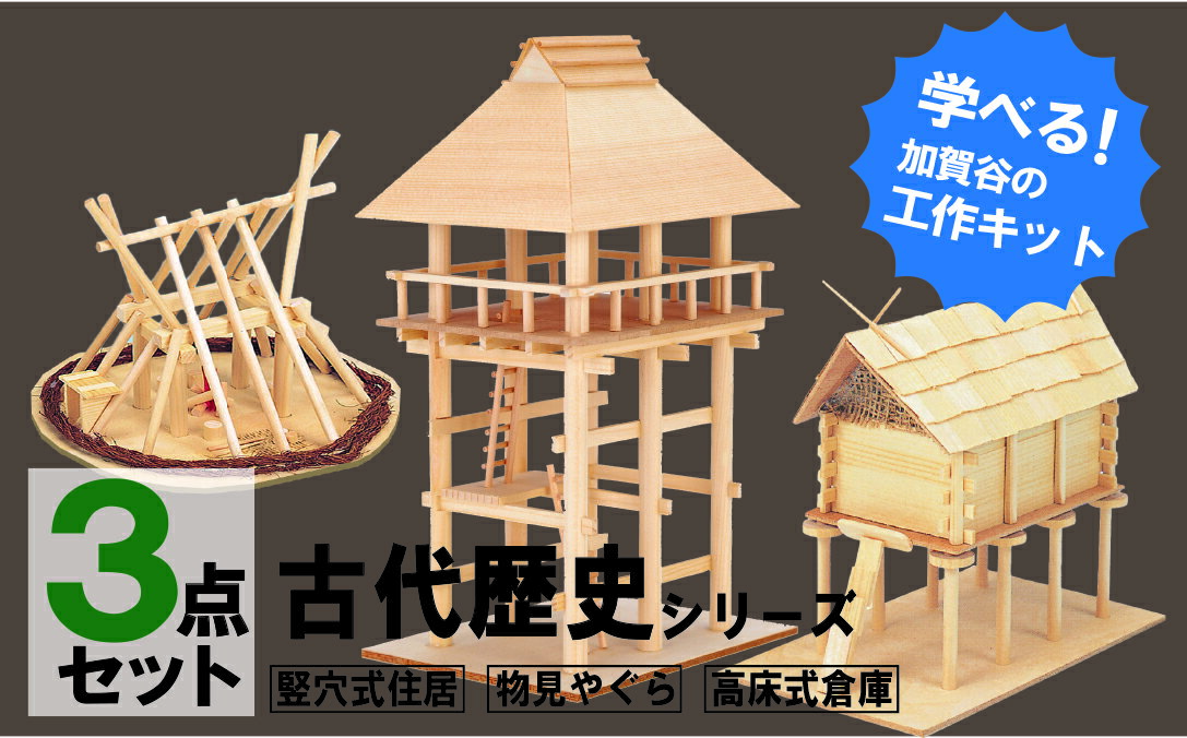 商品詳細 サイズ ・竪穴式住居(完成サイズW236×D190×H160 重さ200g) ・高床式倉庫(完成サイズW117×D190×H180 重さ200g) ・物見やぐら(完成サイズW190×D160×H236 重さ170g) 材料 木工品 ・ふるさと納税よくある質問はこちら ・寄附申込みのキャンセル、返礼品の変更・返品はできません。あらかじめご了承ください。おうち時間を楽しもう!DIY 全国各地で、続々発掘される古代遺跡。物見やぐら・竪穴式住居・高床式倉庫は、はるか古代の夢とロマンを伝えてくれます。 工作キット 古代歴史シリーズのコンプリートセット 工作キット 古代歴史シリーズのコンプリートセット 歴史を学ぶのに活躍する工作キットです。 全国各地で、続々発掘される古代遺跡。物見やぐら・竪穴式住居・高床式倉庫は、はるか古代の夢とロマンを伝えてくれます。 ・竪穴式住居(完成サイズW236×D190×H160 重さ200g) ・高床式倉庫(完成サイズW117×D190×H180 重さ200g) ・物見やぐら(完成サイズW190×D160×H236 重さ170g) 加賀谷木材では木工工作を楽しみながら多くのことを体験できるように商品開発を行い、木工工作キットを「KIT」シリーズを提案しています。 ・技術や文化の基礎・・・木工を通じたものづくりは、技術や文化の基礎となります。 ・豊かな発想・・・どのようなアレンジを加えるか、色を塗るかなど工夫する豊かな発想を育て、計画し、実行する機会を与えます。 ・コミュニケーションを育む・・・制作手順を相談したり、作業を手伝ってもらったりと、家族・友達・多くの人とのコミュニケーションを育みます。 ・木材の特徴を理解・・・木材の材料としての特徴や、道具の正しい使い方などを身につけます。 ・創造的な思考・・・どういう手順で制作するか、どうして失敗したのかといった自ら考える創造的な思考で問題を解決する力を育てます。 取扱先:加賀谷木材株式会社 1.竪穴式住居 2.高床式倉庫 3.物見やぐら 「ふるさと納税」寄附金は、下記の事業を推進する資金として活用してまいります。 寄附を希望される皆さまの想いでお選びください。 (1) 観光の振興に関する事業 (2) 未来を担う子どもの教育、健全育成に関する事業 (3) 福祉及び医療に関する事業 (4) ふるさとの自然環境の保全に関する事業 (5-1) その他まちづくりに関する事業(スポーツ環境) (5-2) その他まちづくりに関する事業(上記以外) 特徴のご希望がなければ、町政全般に活用いたします。 入金確認後、注文内容確認画面の【注文者情報】に記載の住所にお送りいたします。 発送の時期は、寄附確認後2週間以内を目途に、お礼の特産品とは別にお送りいたします。