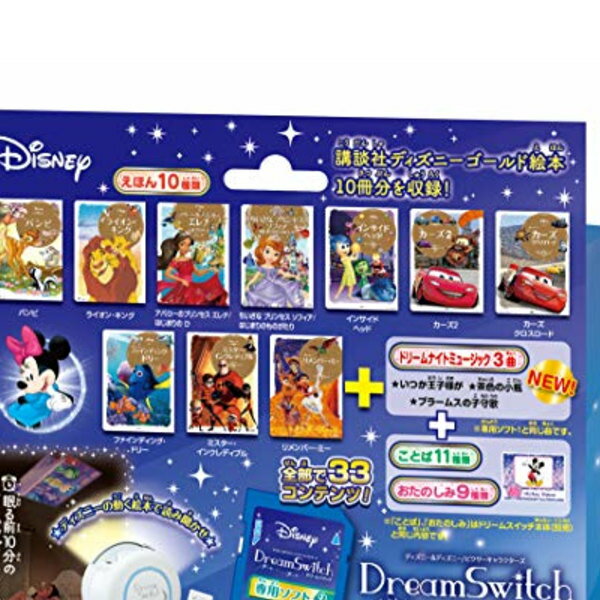 組み立てる必要がありますか?いいえ※本製品はacアダプター同梱です(本体用)リモコン使用電池:単4電池×2個 (別売)dis neydi sney. based on the"winnie the pooh"works by a.a.milne and e.h.shepard.dis ney/pixar slinkydog. poof-slinky,inc. fiat model t porscheディ ズニー&ディ ズニー/ピクサーキャラクターズ ドリーム スイッチおよび専用ソフト1、専用ソフト2と同じ絵本コンテンツを収録しています商品紹介 たっぷり楽しめるディ ズニーの絵本50冊、知育コンテンツ20種を収録 暗くしたお部屋に広がるデ ィズニーのお話がお子様とのコミュニケーションを楽しくします! 映し出される映像は、お子さまの興奮を避ける絶妙なスピードで動きます。ゆったりとしたBGMとナレーションがお子さまの耳に心地よく響き、心を落ち着かせます。 ★ディ ズニーゴールド絵本50冊を含むコンテンツがなんと70種も搭載で毎晩使えます! ! ★スイッチを入れると暗くしたお部屋の天井にディ ズニーのお話が映し出されます! ★70種のコンテンツからお話を選択すると、1話10分程度のお話が始まります。しばらく操作を行わないと、オートオフで終了します。 ★【えほん】講談社のディ ズニーゴールド絵本 50冊 (日本語字幕の有無が選択できるため、声で読み聞かせすることもできます。) ★【ことば】ABCやあいうえお、生活習慣が学べる11種 ★【おたのしみ】ディ ズニーの星空やひつじかぞえなどのエンターテイメントコンテンツ9種 ※「ディ ズニードリームスイッチ」収録の30作品、「ディ ズニードリームスイッチ専用ソフト1」収録の10作品、「ディ ズニードリームスイッチ専用ソフト2」収録の10作品 上記合わせて50作品の絵本が「50ストーリーズ」に収録されています。 安全警告 特になし
