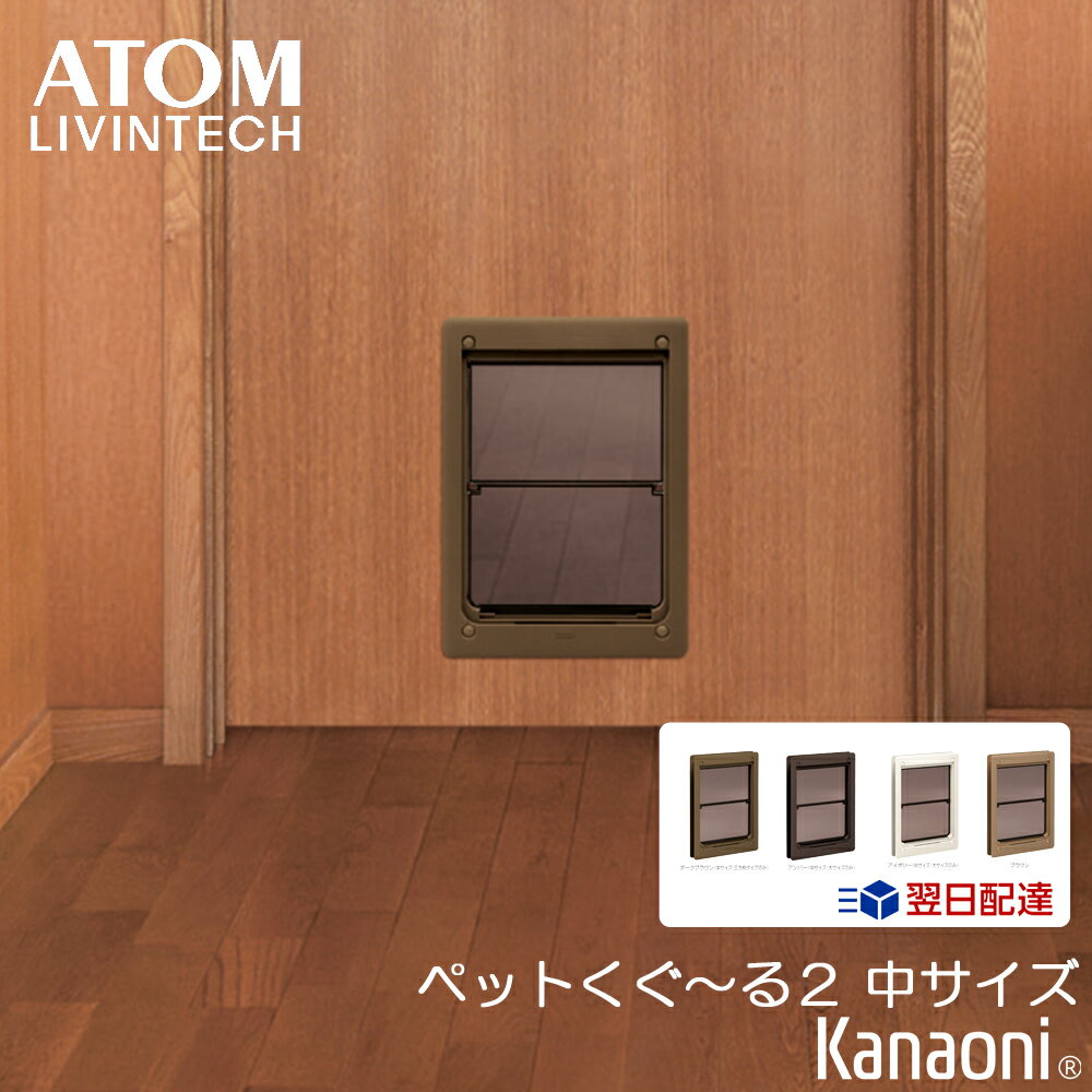 ペットドア 引き戸にもつかえるアトム ペットくぐーる2 ペット用ドア フラップにマグネットが付きました!小型犬・猫用ペットドア ATOM アトムリビンテック ペット用ドア ペットくぐーる2 中サイズ好評のペットくぐーるがリニューアルされて2(ツー)になりました。※従来品からの変更点※・ペットの出入り口寸法が幅198ミリx高さ247ミリと広くなりました。(従来品は幅192.8ミリx高さ237ミリ)・目隠しパネルのツマミがタテ型からヨコ型に変更されて扱いやすくなりました。・フラップを保持するマグネットが非接触型になり操作音が軽減されました。・加工寸法は従来品と変わりません。サイズ 本体外形寸法:縦333mm×横240mm ペット出入口寸法:縦247mm×横198mm 対応扉厚:28mmから36mm材 質 フレーム・フラップ・目隠しパネル:ABS樹脂 ネジ隠しキャップ:ポリプロピレン・開き戸・引戸どちらにも使える小型から中型のペット用ドアです。・ドアや引戸を閉めたままでも、ペットが自由に部屋を行き来できます。・フラップはマグネットで戻ります。フレームカラー 4色ございます。ご注文時に選択してください。252089 ダークブラウン252090 ブラウン252091 アイボリー252092 アンバー 2