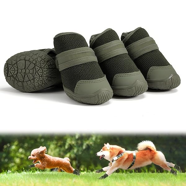 犬靴 犬用ブーツ ドッグシューズ 夜間反射テープ付 軽量通気 メッシュ 抗菌防臭 吸水速乾 履かせやすい 脱げにくい 肉球保護 滑り止め 耐久性ゴム底 散歩 防水 介護 傷舐め防止 小&中型犬 5サイズ 4個セット (グリーン, 5#)