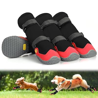犬靴 犬用ブーツ ドッグシューズ 裏起毛 秋冬用 防寒 保温 2重構造テープ 履かせやすい 脱げにくい 肉球保護 滑り止め 耐久性ゴム底 散歩 雨の日 防水 傷舐め防止 介護 夜間反射テープ付 小&中&大型犬 8サイズ 4個セット (レッド, 6#)