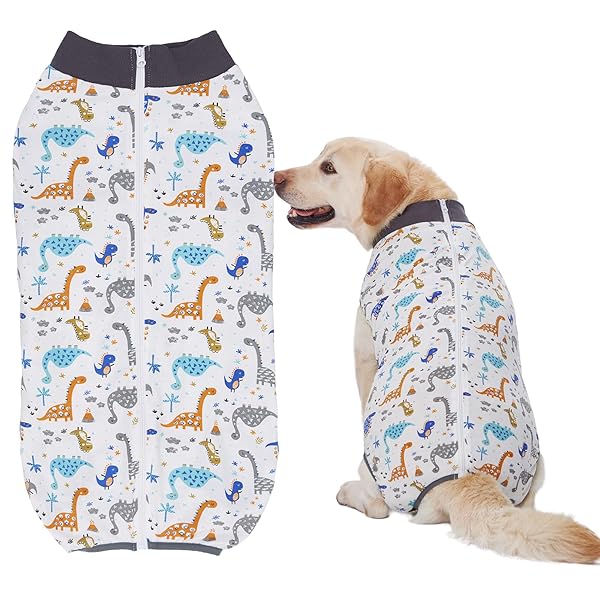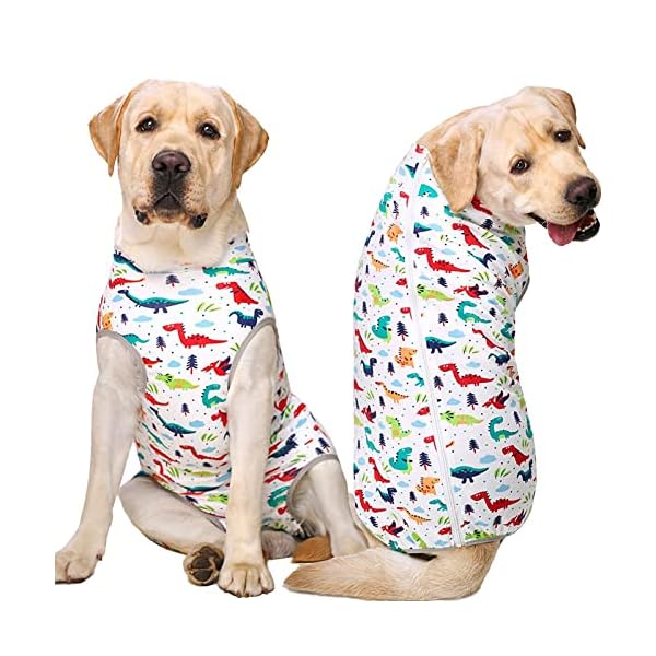 KUVEELA PET 大型犬 中型犬 術後服 メス オス 犬 手術後 服 犬用術後ウェア 介護服 ペット服 エリザベスカラー 避妊 離乳 傷口保護((恐竜柄)ホワイト 3L)