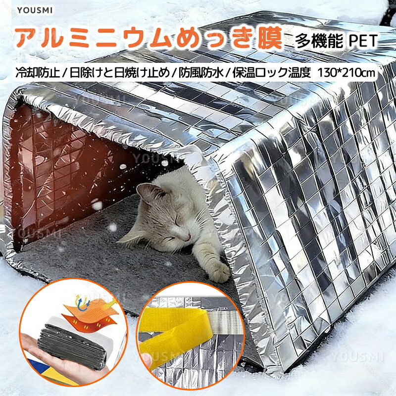多機能PET断熱 アルミニウムめっき断熱シート ペット用 野良猫 防寒シェルターカバー 軽量 防寒 防風 多機能 保温ブランケット 猫 犬 屋外用 防水 日除け 多機能 130×210cm 両面テープ付き 貼り付け簡単 繰り返し使用可 防災