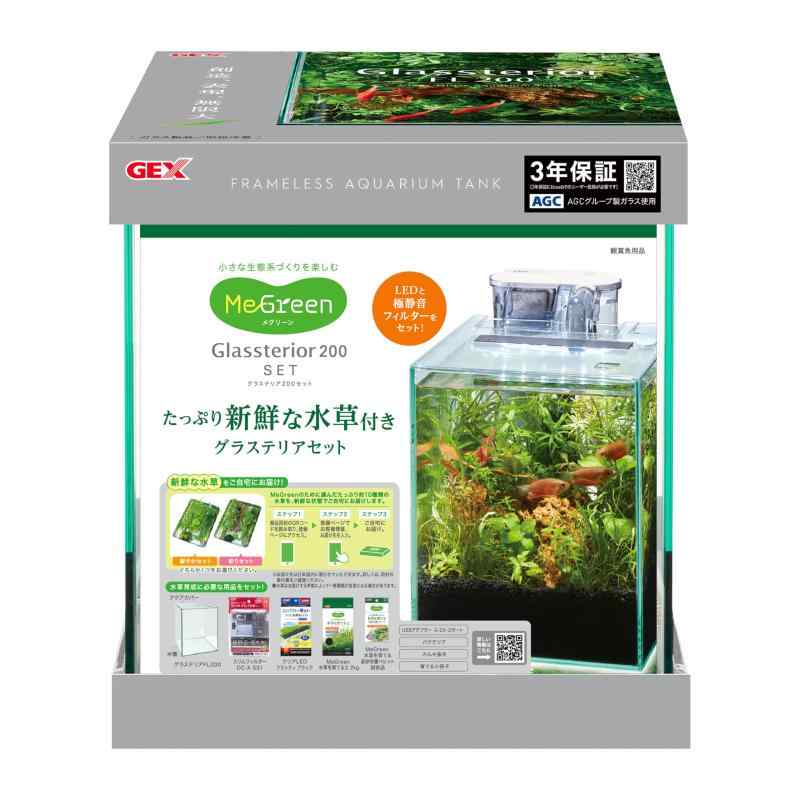 GEX MeGreen 新鮮な水草付き グラステリア200セット 水草育成用品セット 別送でたっぷり水草が届く スリムフィルター・クリアLED・水草を育てる土 フレームレス水槽 W20×D20×H25cm 約8L自然を知ろう、学ぼう、楽しもう。小さな生態系づくりを楽しむ水槽セットグラステリアFL200に極静音スリムフィルターDC-X SS1、クリアLEDフラッティ ブラック、水草を育てる土といった、水草育成に必要な用品をセットしたスターターセットです。●たっぷり新鮮な水草付きグラステリアセット●新鮮な水草をご自宅にお届け鮮やかセット・彩りセットどちらか1つをお選びください。MeGreenのために選んだたっぷり約10種類の水草を、新鮮な状態でご自宅にお届けします。「MeGreen 新鮮な水草付き グラステリア200セット」を購入し、ご自宅に到着後に商品同封のQRコードを読み取り、登録ページにアクセスする必要があります。<水槽サイズ>約W20.0×D20.0×H25.0cm <セット時サイズ>約W20.0×D25.5×H28.5cm <水容量>約8L <セット内容>ガラス水槽(グラステリアFL200)、フタ(アクアカバ-500)、外掛け式フィルター(スリムフィルターDC-X SS1)、クリアLED フラッティブラック、MeGreen水草を育てる土 2kg、MeGreen水草を育てる底砂栄養ペレット試供品、USBアダプター G-2A、育てる小冊子、登録用QRコード(お客様情報の登録が完了後、水草を後日、自宅へお届けします)