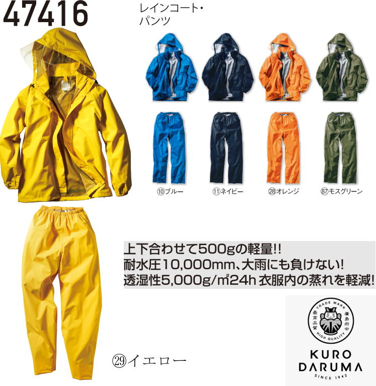 クロダルマ 47416 レインコート&パンツ 商品の特長 上下合わせて約500gと軽量化を実現。 ムレを防ぐ裏地メッシュ、 取り外し可能なフード付き。 背中上部には視認性の高い 反射プリントを採用。 素材 表:ポリエステル100%(タフタ)(TPUラミネート) 裏:ポリエステル100%(メッシュ) カラー ブルーネイビーオレンジ イエローモスグリーン サイズ S・M・L・LL・3L・4L・5L ・モニター等の環境による色の誤差や、素材により色ブレが生じる場合があります。 ・表記サイズには若干の誤差が生じる場合があります。 ・ご注文のタイミングによって、商品が欠品している可能性があります。 ・運送会社の状況・災害時・繁忙期などにより配送が遅延する可能性があります。 ・土・日・祝は休業日となっております。発送までの日数には含まれませんのでご注意ください。クロダルマ 関連商品