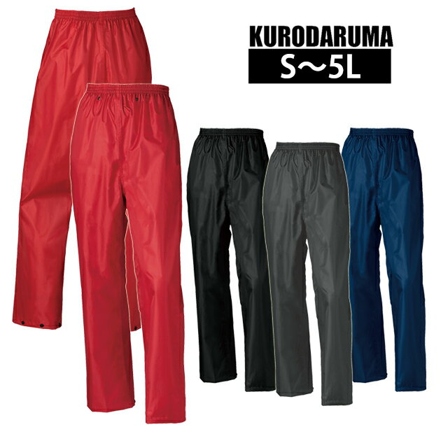 適応サイズ(cm) サイズ ウエスト 股下 S 68-76 69 M 76-84 72 L 84-94 74 LL 94-104 76 3L 100-110 79 4L 110-118 79 5L 118-130 79 商品詳細 メーカー クロダルマ 品番 47412 素材 リップストップ210T PUコーティング 混率 表:ポリエステル100% 裏:ポリエステル100%(メッシュ) 特徴 万一生地が裂けてもそれ以上広がらない、リップストップ生地を採用。 耐水圧10,000mm・透湿性3,000g ウエスト全ゴムタイプ パンツエア抜き 裾調節ボタン サイズ S,M,L,LL,3L,4L,5L カラー レッド(70)、チャコールグレー(48)、ネイビー(11)、ブラック(49)