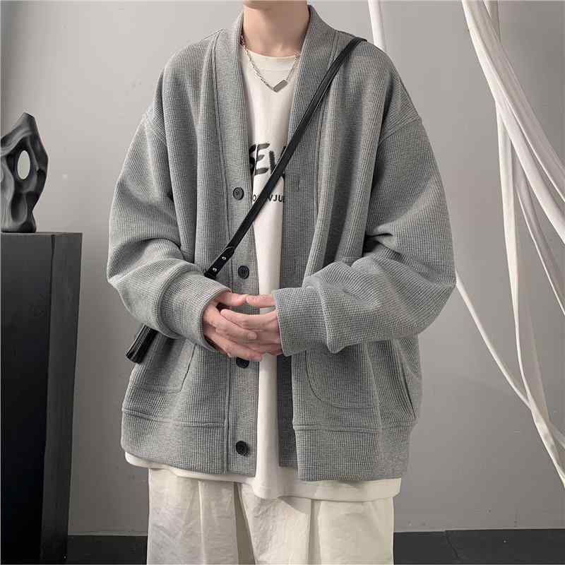 スウェット メンズ ワッフル Vネック カーディガン トップス 春秋 普段使い リラックス ゆったり ブラック グレー ホワイト ポリエステル 長袖