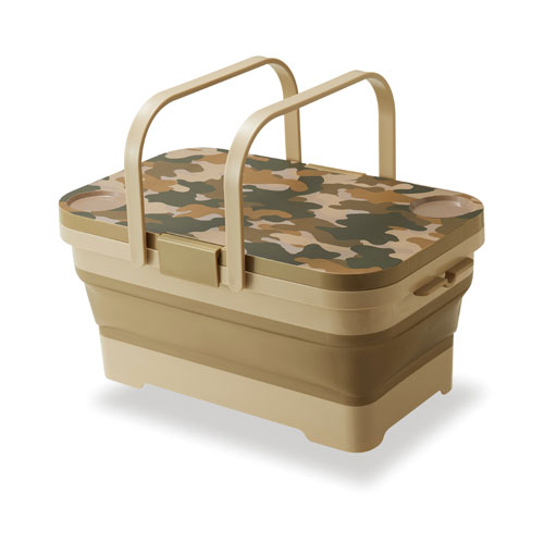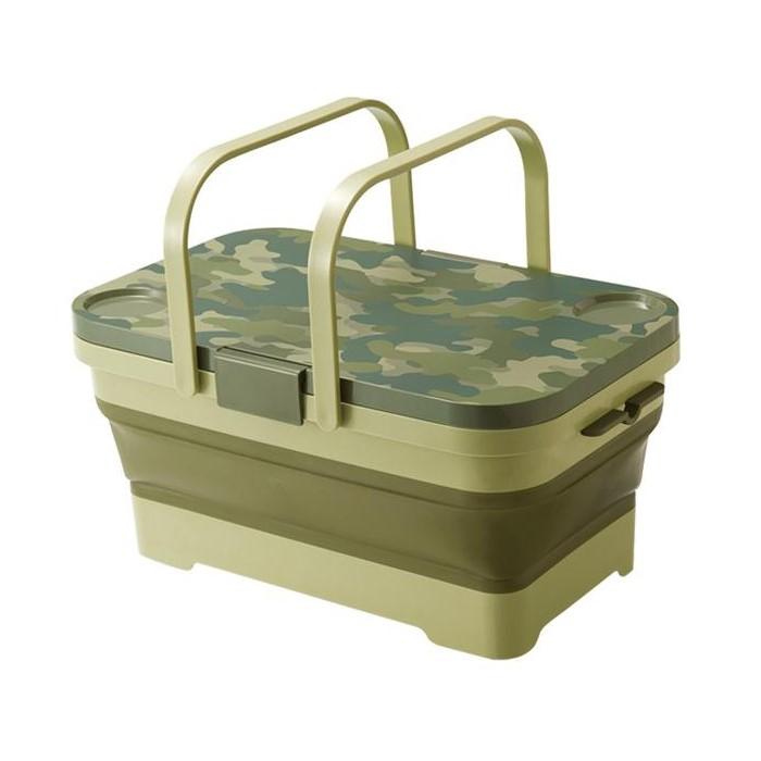 PICK UP BRANDフタがテーブルになるたっぷり入るバスケット 使用後は折りたたんでコンパクトに収納できるバスケット&テーブル。両手で本体をしっかり持って、同時に押し下げると簡単にコンパクトにたためます。広げ方も底を押さえながら本体の左右を交互に引き上げるだけ。 バーベキューなどのアウトドアシーンで荷物を運んだり、中に氷水を入れてドリンクを冷やしたりと大活躍。野菜やフルーツを洗いにも使えます。 バスケットの容量は15リットルでたっぷり入ります。 フタは外すと脚付きのテーブルに早変わり。飲み物を安定して置けるドリンクホルダーも2個ついています。 食べ終わったら水を溜めて食器洗いとしても便利。便利な水抜き栓付きで水抜きも簡単です。 品名 折りたたみバスケット&テーブル ミラーゴ I-582 カラー グリーン/カーキ サイズ 折りたたみ時:約46.3×29×8.6cm 組み立て時:約46.3×29×21.4cm 容量 15L 重量 約1,552g 材質 本体,水抜き栓:熱可塑性エラストマー(耐熱温度:100℃、耐冷温度:-20℃) 枠,底,ハンドル,止め具:ポリプロピレン テーブル:ABS樹脂(耐熱温度:80℃、耐冷温度:-20℃) 脚:鉄,ユニクロメッキ 製造元 ISETO 生産国 日本
