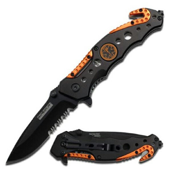 【商品詳細】 「TAC FORCE」折りたたみ式 EMT ナイフです!中央に「スターオブライフ」のエンブレムが配置されたデザイン! ハーフセラテッド(鋸刃)の刃が付いていて、「ガラスブレイカー」、「シートベルトカッター」が付いている仕様です! いざというときの緊急用として!カラーも目立つ「メタリックオレンジ」が使われています! 【商品詳細】 ・全体の長さ(約):20cm ・刃渡り(約):8.5cm ・ブレードの厚さ(約):3mm ・ブランド:TAC FORCE 【関連商品】 ■他のナイフはコチラ 【注意事項】 輸入品を含む一部の商品は検品のため開梱させて頂く場合がございます。また、新品であってもパッケージや本体に細かな傷や汚れがある場合がございますので、ご了承のうえお買い上げ頂きますようお願い致します。これらの傷は海外輸送時やアンティーク品のためについたものであり、不良品や中古品ではありませんのでご安心下さい。