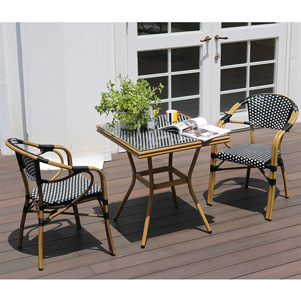 [送料無料]スクエアテーブル3点セット「プレジール」 ブラック(PLS-S70-3PSET-BLK)自宅がパリのオープンカフェに。新婚旅行で行ったヨーロッパの街並み。雑誌で見かけた素敵なカフェ。「あの雰囲気を再現するにはどうしたらいいんだろう…」そんな風に考えている方も多いのではないでしょうか?実際に欧米のカフェで使われている「Pleaisir(プレジール)」シリーズは、バイヤーがたまたま休暇で訪れたフランスのニースにあるカフェで、一目ぼれしたものなのです。日本にはなかなかない形とカラーリングは、カフェの本場で長く愛用され、継承されてきた、スタンダードなデザイン。実際に座ってみると、見た目の高級感に反して軽く、急な雨でも水はけ抜群。テラス席に置きっぱなしでも華やかさを保つことができる高い機能性も、長く愛用されてきた理由だとわかるのです。※北海道・沖縄・離島は別途送料が必要となります。サイズ(約)テーブル/幅70cm、奥行き70cm、高さ74.5cmチェア/幅58cm、奥行き60cm、高さ82cm(座高45cm)重量(約)テーブル/10.7kgチェア/4kg(1脚)材質アルミフレーム・PEラタン・強化ガラスカラーブラック仕上げ粉体塗装(フレーム部分)組立区分テーブル/組立品チェア/完成品組立目安時間テーブル/2人で20分※写真はイメージです。■お届け地域について ・北海道、沖縄、離島へのお届けは、追加送料(実費)をいただきます。ご注文/お問い合わせをいただきましてからお見積りします。 ■メーカー直送品のため、下記サービスはお受けできません。・お届け時間帯指定(午前・午後のご希望は承りますが、状況によりずれる場合があります。夜間指定はできません)・一部の郡部での日曜・祝日指定・メッセージカードの添付