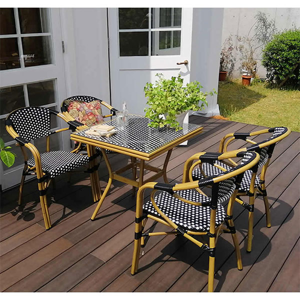 [送料無料]スクエアテーブル5点セット「プレジール」 ブラック(PLS-S70-5PSET-BLK)自宅がパリのオープンカフェに。新婚旅行で行ったヨーロッパの街並み。雑誌で見かけた素敵なカフェ。「あの雰囲気を再現するにはどうしたらいいんだろう…」そんな風に考えている方も多いのではないでしょうか?実際に欧米のカフェで使われている「Pleaisir(プレジール)」シリーズは、バイヤーがたまたま休暇で訪れたフランスのニースにあるカフェで、一目ぼれしたものなのです。日本にはなかなかない形とカラーリングは、カフェの本場で長く愛用され、継承されてきた、スタンダードなデザイン。実際に座ってみると、見た目の高級感に反して軽く、急な雨でも水はけ抜群。テラス席に置きっぱなしでも華やかさを保つことができる高い機能性も、長く愛用されてきた理由だとわかるのです。※北海道・沖縄・離島は別途送料が必要となります。サイズ(約)テーブル/幅70cm、奥行き70cm、高さ74.5cmチェア/幅58cm、奥行き60cm、高さ82cm(座高45cm)重量(約)テーブル/10.7kgチェア/4kg(1脚)材質アルミフレーム・PEラタン・強化ガラスカラーブラック仕上げ粉体塗装(フレーム部分)組立区分テーブル/組立品チェア/完成品組立目安時間テーブル/2人で20分チェア※写真はイメージです。■お届け地域について ・北海道、沖縄、離島へのお届けは、追加送料(実費)をいただきます。ご注文/お問い合わせをいただきましてからお見積りします。 ■メーカー直送品のため、下記サービスはお受けできません。・お届け時間帯指定(午前・午後のご希望は承りますが、状況によりずれる場合があります。夜間指定はできません)・一部の郡部での日曜・祝日指定・メッセージカードの添付