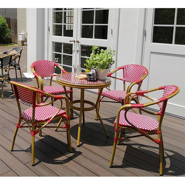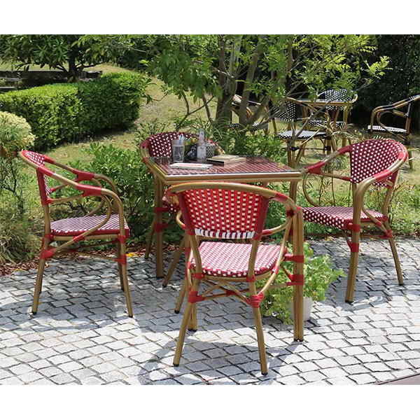 [送料無料]スクエアテーブル5点セット「プレジール」 レッド(PLS-S70-5PSET-RED)自宅がパリのオープンカフェに。新婚旅行で行ったヨーロッパの街並み。雑誌で見かけた素敵なカフェ。「あの雰囲気を再現するにはどうしたらいいんだろう…」そんな風に考えている方も多いのではないでしょうか?実際に欧米のカフェで使われている「Pleaisir(プレジール)」シリーズは、バイヤーがたまたま休暇で訪れたフランスのニースにあるカフェで、一目ぼれしたものなのです。日本にはなかなかない形とカラーリングは、カフェの本場で長く愛用され、継承されてきた、スタンダードなデザイン。実際に座ってみると、見た目の高級感に反して軽く、急な雨でも水はけ抜群。テラス席に置きっぱなしでも華やかさを保つことができる高い機能性も、長く愛用されてきた理由だとわかるのです。※北海道・沖縄・離島は別途送料が必要となります。サイズ(約)テーブル/幅70cm、奥行き70cm、高さ74.5cmチェア/幅58cm、奥行き60cm、高さ82cm(座高45cm)重量(約)テーブル/10.7kgチェア/4kg(1脚)材質アルミフレーム・PEラタン・強化ガラスカラーブラック仕上げ粉体塗装(フレーム部分)組立区分テーブル/組立品チェア/完成品組立目安時間テーブル/2人で20分チェア※写真はイメージです。■お届け地域について ・北海道、沖縄、離島へのお届けは、追加送料(実費)をいただきます。ご注文/お問い合わせをいただきましてからお見積りします。 ■メーカー直送品のため、下記サービスはお受けできません。・お届け時間帯指定(午前・午後のご希望は承りますが、状況によりずれる場合があります。夜間指定はできません)・一部の郡部での日曜・祝日指定・メッセージカードの添付