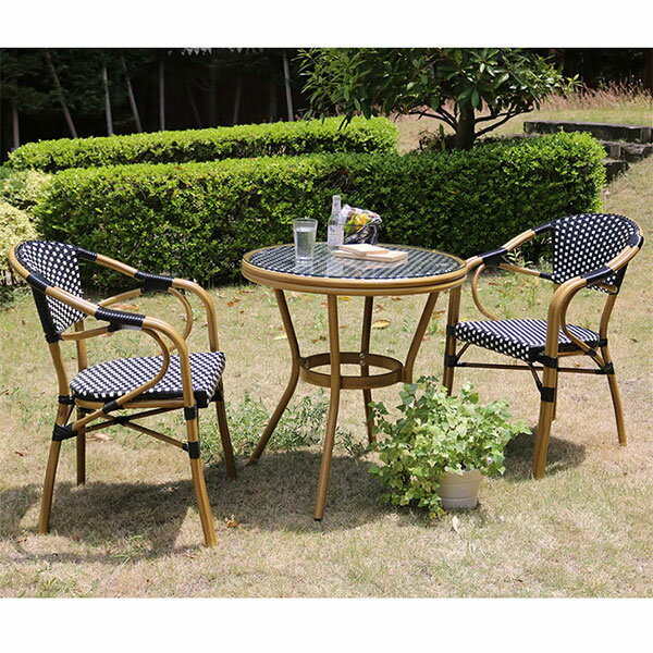 [送料無料]ラウンドテーブル3点セット「プレジール」 ブラック(PLS-R70-3PSET-BLK)自宅がパリのオープンカフェに。新婚旅行で行ったヨーロッパの街並み。雑誌で見かけた素敵なカフェ。「あの雰囲気を再現するにはどうしたらいいんだろう…」そんな風に考えている方も多いのではないでしょうか?実際に欧米のカフェで使われている「Pleaisir(プレジール)」シリーズは、バイヤーがたまたま休暇で訪れたフランスのニースにあるカフェで、一目ぼれしたものなのです。日本にはなかなかない形とカラーリングは、カフェの本場で長く愛用され、継承されてきた、スタンダードなデザイン。実際に座ってみると、見た目の高級感に反して軽く、急な雨でも水はけ抜群。テラス席に置きっぱなしでも華やかさを保つことができる高い機能性も、長く愛用されてきた理由だとわかるのです。※北海道・沖縄・離島は別途送料が必要となります。サイズ(約)テーブル/幅70cm、奥行き70cm、高さ74.5cmチェア/幅58cm、奥行き60cm、高さ82cm(座高45cm)重量(約)テーブル/8.7kgチェア/4kg(1脚)材質アルミフレーム・PEラタン・強化ガラスカラーブラック仕上げ粉体塗装(フレーム部分)組立区分テーブル/組立品チェア/完成品組立目安時間テーブル/2人で20分※写真はイメージです。■お届け地域について ・北海道、沖縄、離島へのお届けは、追加送料(実費)をいただきます。ご注文/お問い合わせをいただきましてからお見積りします。 ■メーカー直送品のため、下記サービスはお受けできません。・お届け時間帯指定(午前・午後のご希望は承りますが、状況によりずれる場合があります。夜間指定はできません)・一部の郡部での日曜・祝日指定・メッセージカードの添付