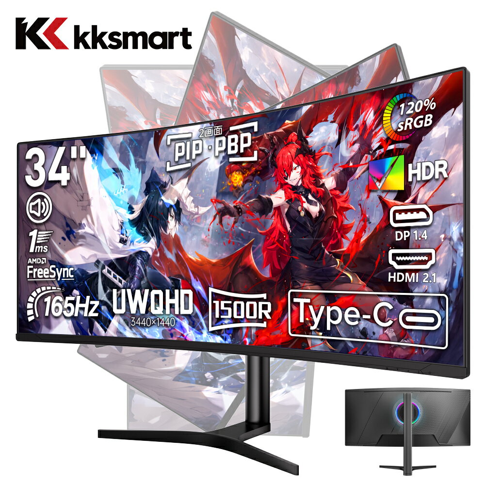 Type-Cモデル【ポイント10倍獲得!】34インチ USB-C接続 UWQHD ゲーミングモニター 湾曲 3440×1440 Ultraワイド 165Hz/144Hz/120Hz PCモニター 120%sRGB 350nits PIP/PBP画面分割【FreeSync/HDR/1ms応答】VA 非光沢 1500R VESA RGB チルト/水平/高さ調整 kksmart HG-34QC