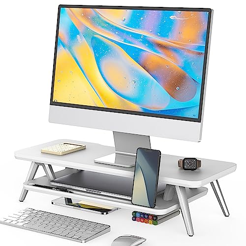 Fenge モニター台 机上 60cm横幅 2段 パソコンスタンド 木製天板 アルミニ脚 デスクトップ用 収納 整理整頓ホワイトG04A2061A