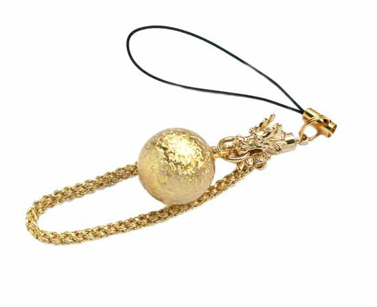 風水で龍は最もパワーがあるとされ、特に黄金の龍は最強 の力を持つといわれています。 富貴・吉祥であり邪気を退けてくれると信じられています。 龍が、口にくわえる宝珠は、澄み渡る水琴の音色が心身 に安らぎと癒しをもたらし、その響きが、厄を払い開運へと 導いてくれると、伝えられます。 【素材】 真鍮(金メッキ)、化学繊維 サイズ:全長:約14cm 龍パーツ:約15×9×11mm 水琴鈴 丸型 金色:約17mm