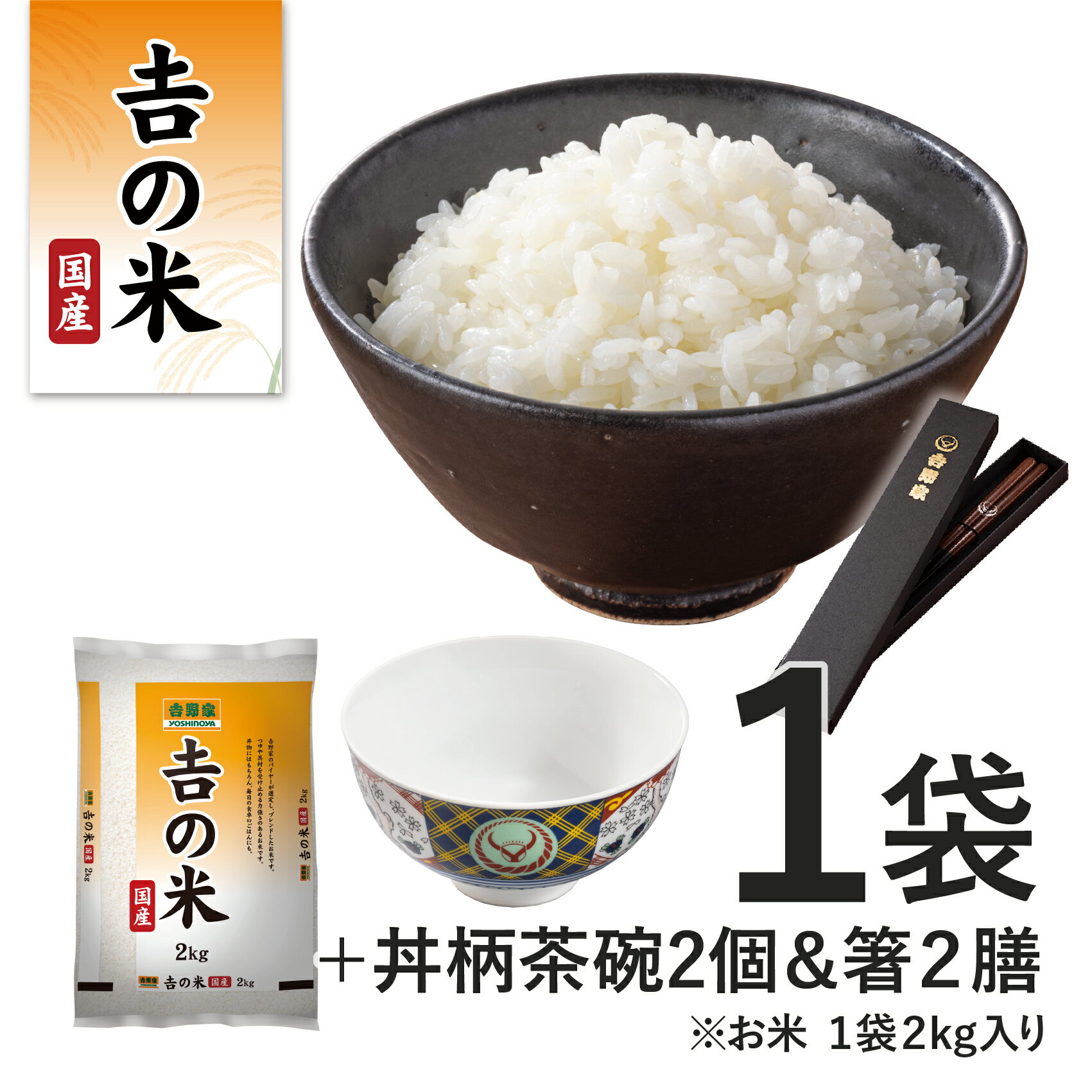 \令和7年産の新米/ 吉野家 公式 【常温】国産「吉の米」 2kg(1袋)+茶碗×2個/箸×2膳【冷凍商品/メール便商品同時購入不可】2kg 国産米 新米 令和七年 米 精米 お米 おこめ 白米 ギフト プレゼント お歳暮 お年賀 令和7年産 新米使用