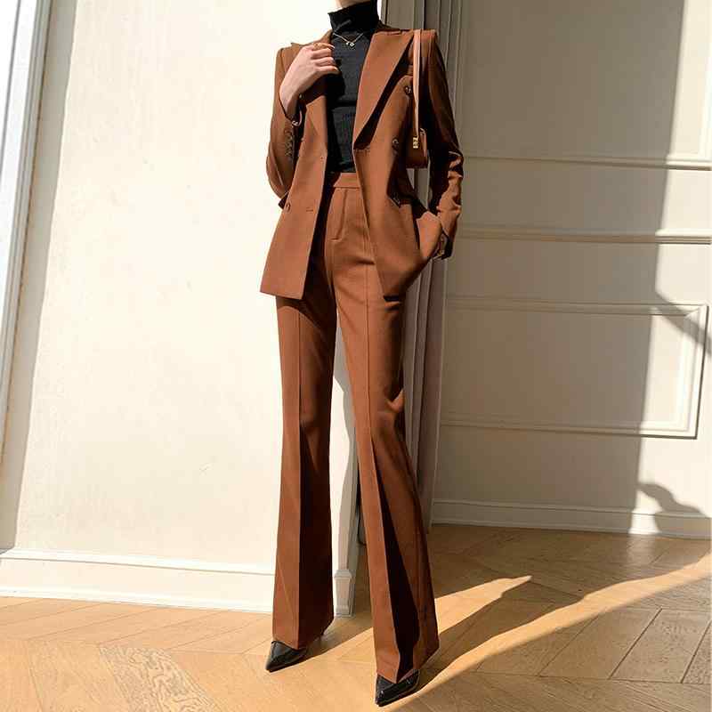 セットアップ レディース テーラードジャケット ロングパンツ 2点セット 春秋 長袖 ビジネス オフィス カジュアル フォーマル スーツ 韓国風 おしゃれ デザイン性 ポリエステル ストレッチ ブラック ブラウン グレー 通勤 普段使い 入園式 卒業式