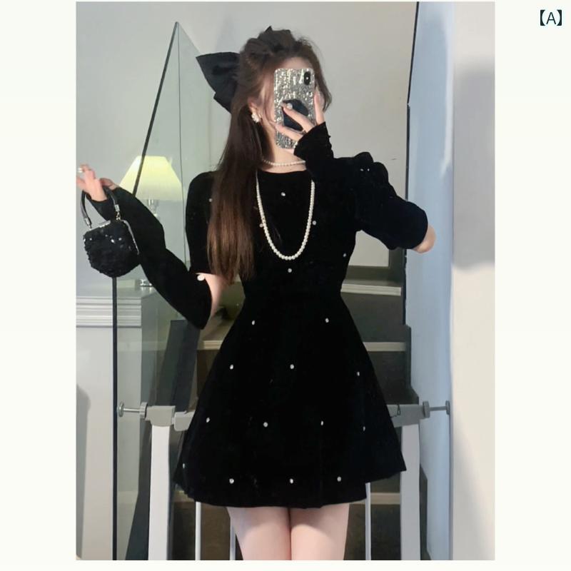ワンピース レディース おしゃれ 秋冬 ブラック パフスリーブ シルエット パール風ストーン 袖 スタイルアップ ミニ丈 パーティー 発表会 セレモニー 華やか ベルベット 上品 キラキラ かわいい ガーリー 韓国
