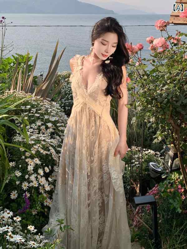ワンピース レディース フランス レトロ ロング ドレス Vネック ホリデー ビーチ ドレス サスペンダー ドレス ハイエンド ランナウェイ プリンセス ドレス