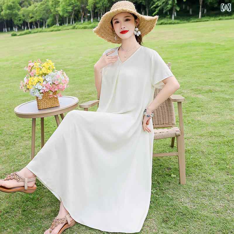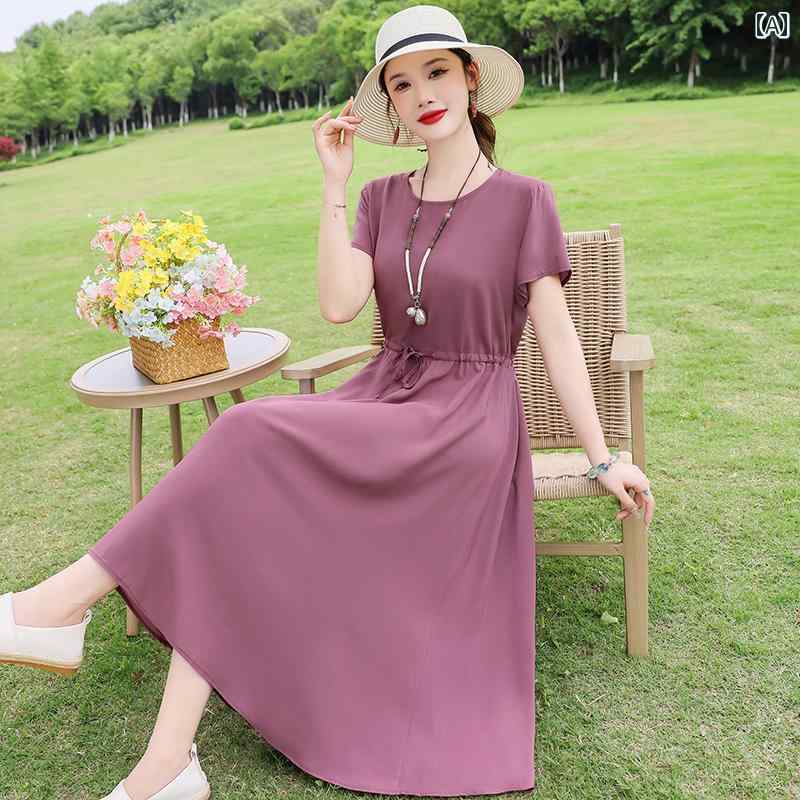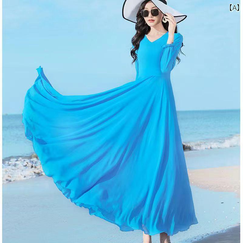 ワンピース レディース ホリデー ビーチ 無地 シフォン ミドル丈 ドレス 女性用 ロングスカート サマースタイル 旅行向け 動きやすさ
