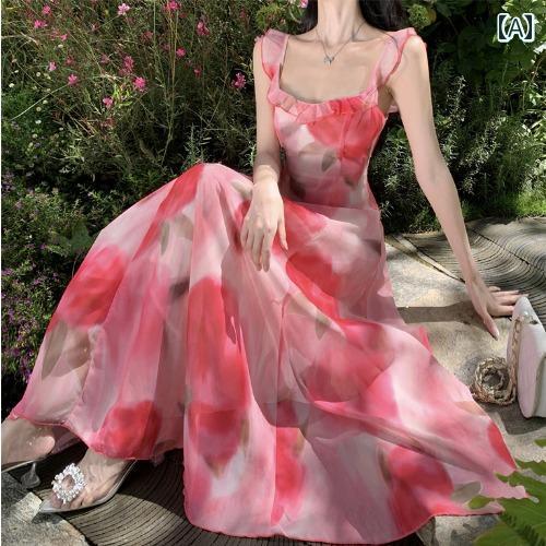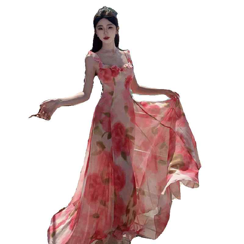 ワンピース レディース 大人 リゾートホリデー ビーチ ドレス スイート フェアリー エレガント ロング スカート プリント シフォン サスペンダー ドレス