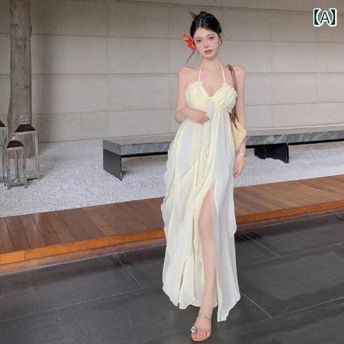 ワンピース レディース 大人 リゾート ホルターネック サスペンダー ドレス サマー ロング ドレス ホワイト バックレス シーサイド ホリデー ビーチ ドレス