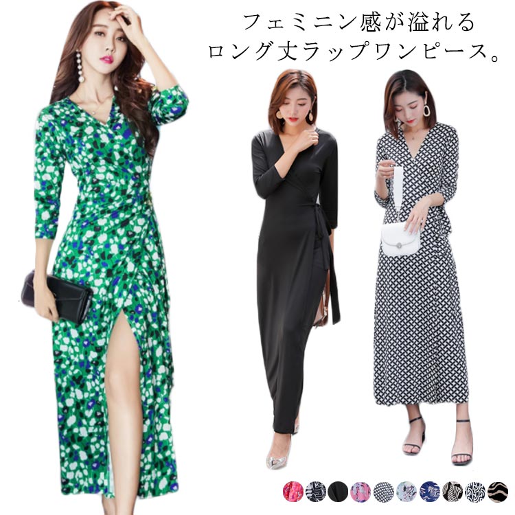 ラップワンピース レディース ロングワンピース マキシワンピース 花柄 フレアワンピース 七分袖 Vネック ハイウエスト ウエストリボン スリット入り ふんわり キレイめ こなれ感 フェミニン エレガント セクシー リゾート 通勤 お出かけ おしゃれ オフィス OL 送料無料