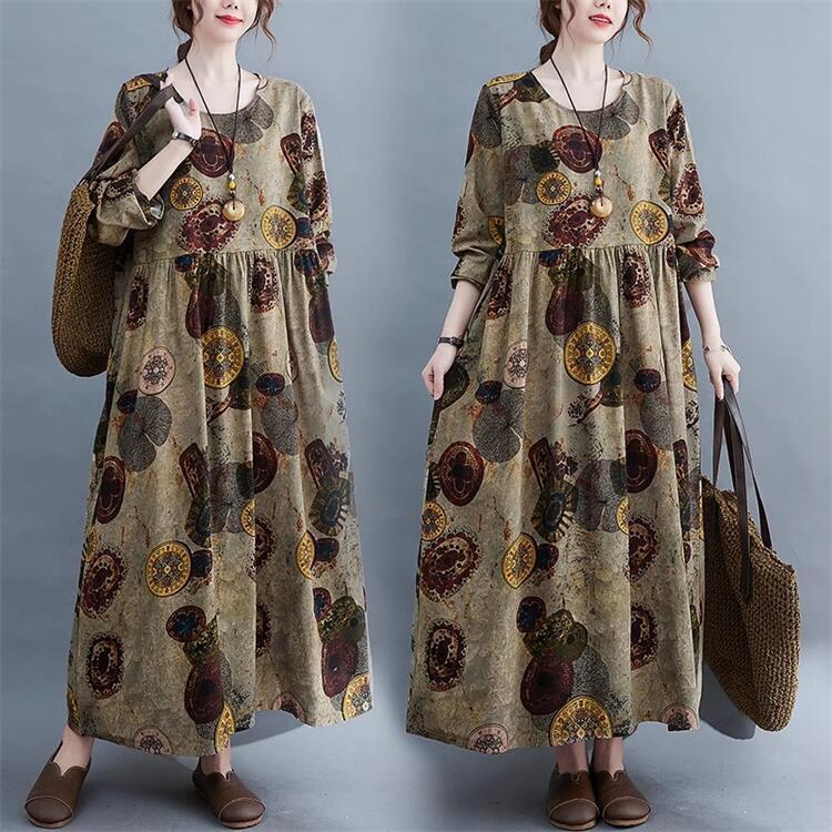 レディース ロングワンピース ブラウン マキシ丈 ロング丈 カジュアル プリント 花柄 体型カバー 春秋 長袖 春 きれいめ ロング 丸襟 ワンピース 柔らか シンプル 30代40代50代 送料無料フリーサイズ 大きいサイズ ゆったり