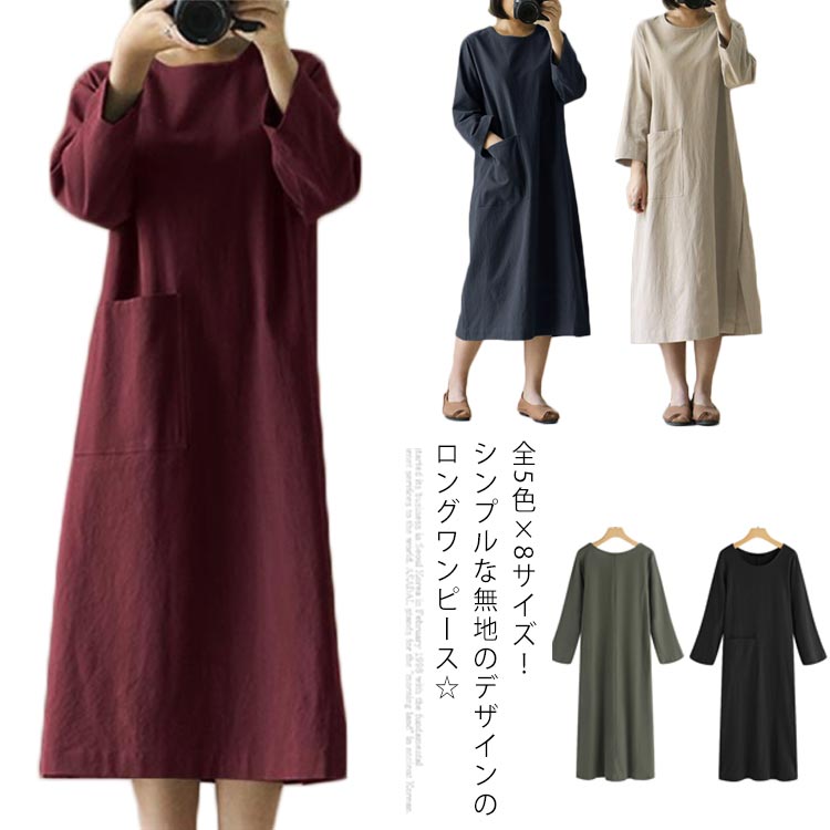 送料無料 ロングワンピース レディース ワンピース ワンピ ミモレ丈 長袖 春 夏 秋 体型カバー 大きいサイズ きれいめ ゆったり 綿麻混風 着痩せ 無地 シンプル おしゃれ 30代 40代 50代