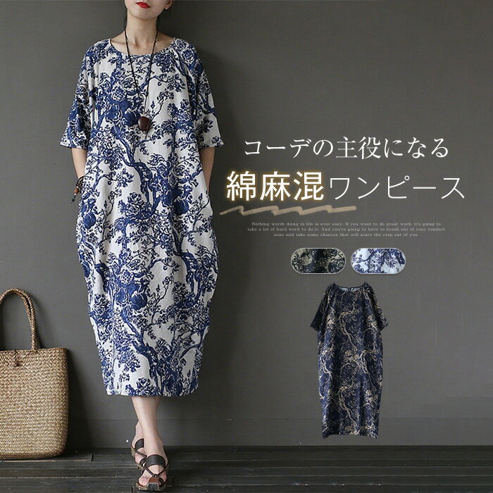 プリント ワンピース 総柄 レディース 半袖 春夏 ロング丈 ロングワンピース 夏 綿麻 涼しい オーバーサイズ 体型カバー リネンワンピース 大きいサイズ ゆったり ゆる ビッグシルエット バルーン ワンピース 美脚 カジュアル ナチュラル リネン 50代 40代 新作 送料無料