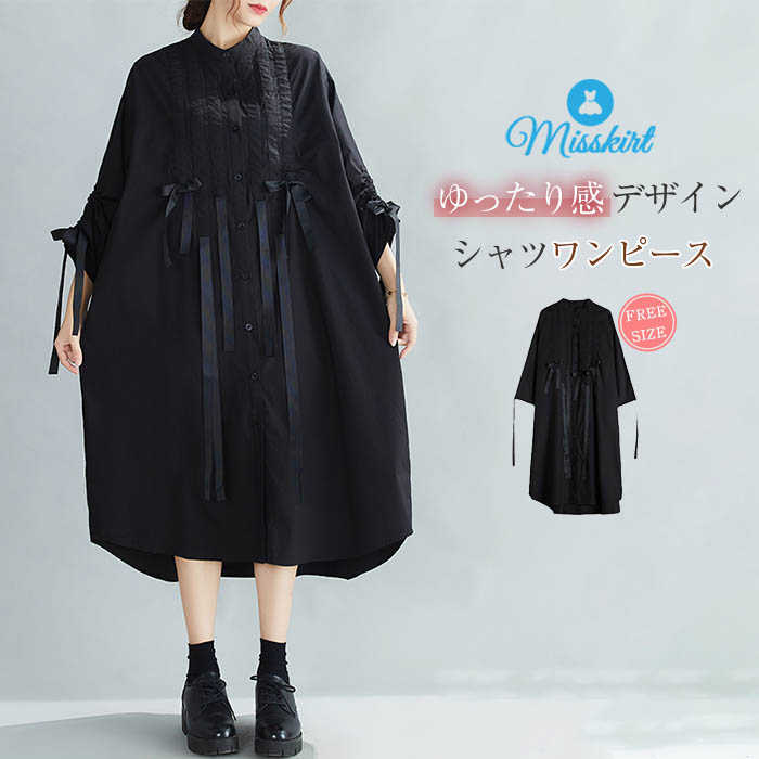 ワンピース チュニック プリーツ レディース シャツワンピース 切り替え 長袖 プリーツ 立ち襟 リボン 体型カバー ゆったり 春 秋 ボタン シンプル お洒落 Aライン カジュアル エレガント 可愛い 大きいサイズ 着痩せ 通勤 OL オフィス 20代 30代 40代 50代 送料無料