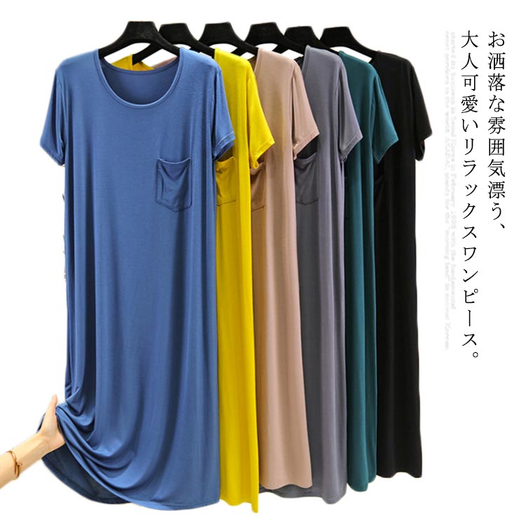 送料無料ワンピース レディース ロングワンピース 半袖 ミモレ丈 体型カバー リラックス感 薄手 ルームウェア 着痩せ 夏物 ゆったり カジュアル 部屋着 ポケット付き