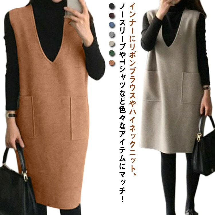 7色 ジャンパースカート vネック ワンピース ノースリーブ 春秋 秋 冬 秋冬 ジャンスカ オーバーオール 膝丈 きれいめ おしゃれ 通勤 会社