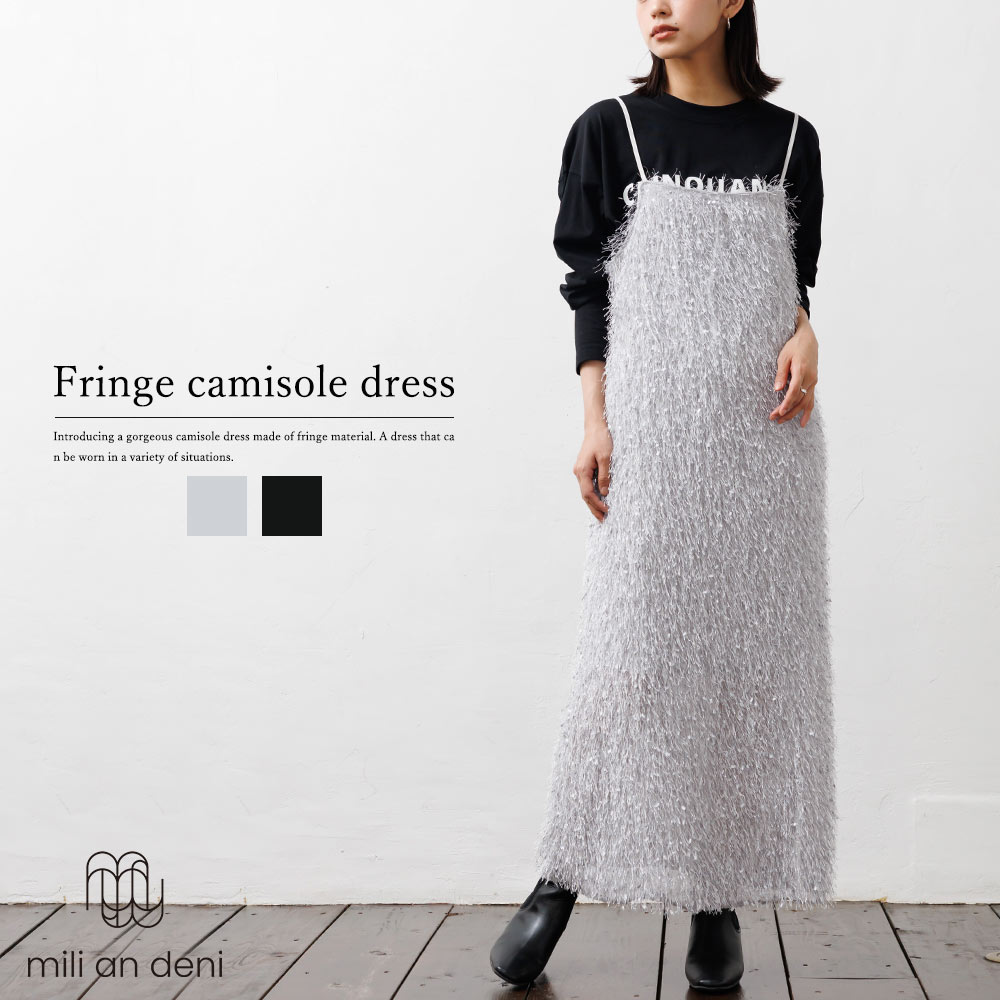 【17%OFFクーポン】フリンジキャミワンピース キャミソール 無地 ロング丈 マキシ丈ワンピース ゆったり ブラック シルバー レディース 春 夏 秋 ミリアンデニ